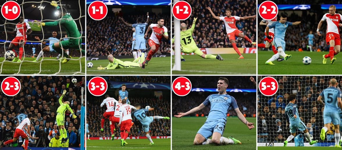 The practical ramifications of this astonishing exhibition of attack and counter-attack is that City must now be the favourites to advance to the last eight thanks to goals from Raheem Sterling, two from Sergio Aguero and one apiece for John Stones and Leroy Sane.