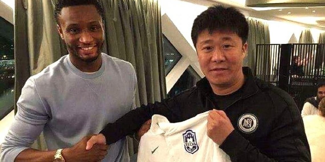 A picture was shared on Chinese website Webo of former Chelsea midfielder Mikel shaking hands with a Tianjin club official and holding the club’s shirt.