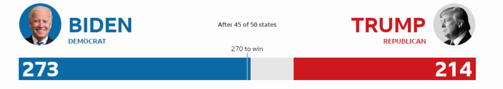 The BBC projects that he has reached 273 electoral college votes, meaning that he’ll become the president in January, pending the outcome of any legal challenges.