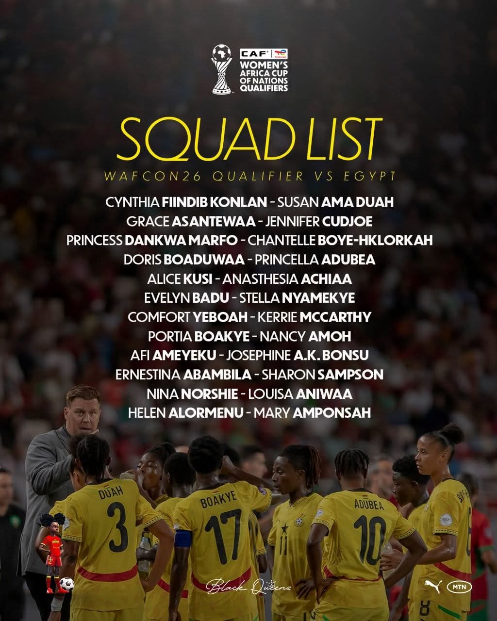 Coach Björkegren’s final list also features trusted names like Ernestina Abambila, Josephine Bonsu, Nina Norshie, Anasthesia Achiaa, and Louisa Aniwaa, whose recent performances have helped the team build confidence and cohesion.