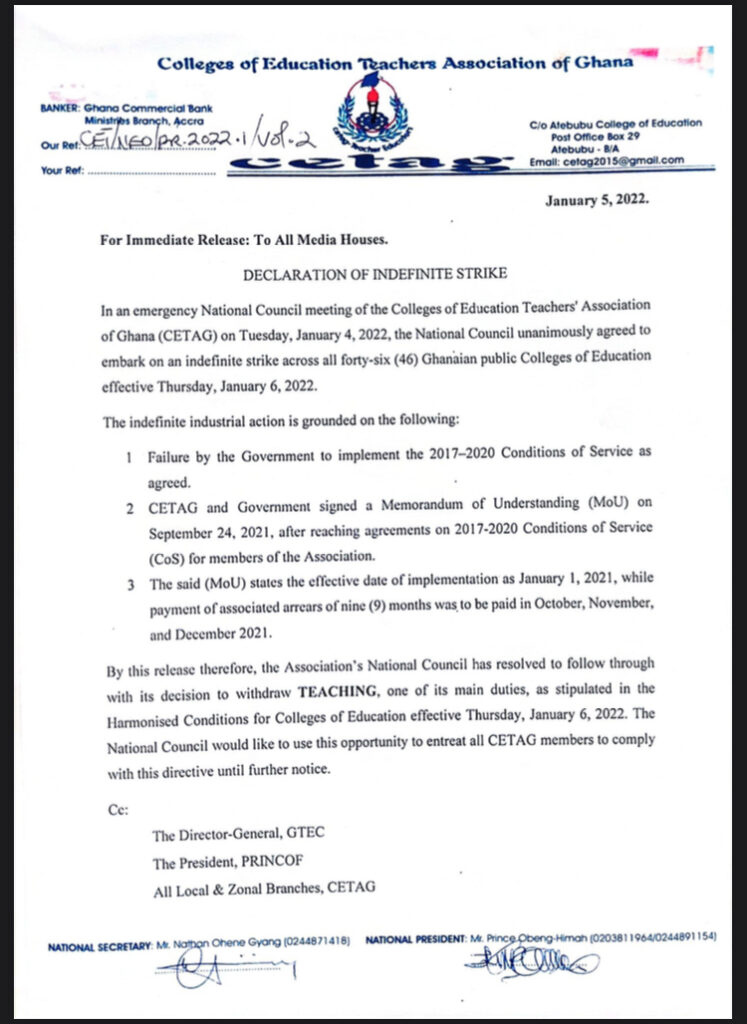 Members of the Colleges of Education Teachers Association of Ghana have withdrawn teaching service starting Thursday January 6.
