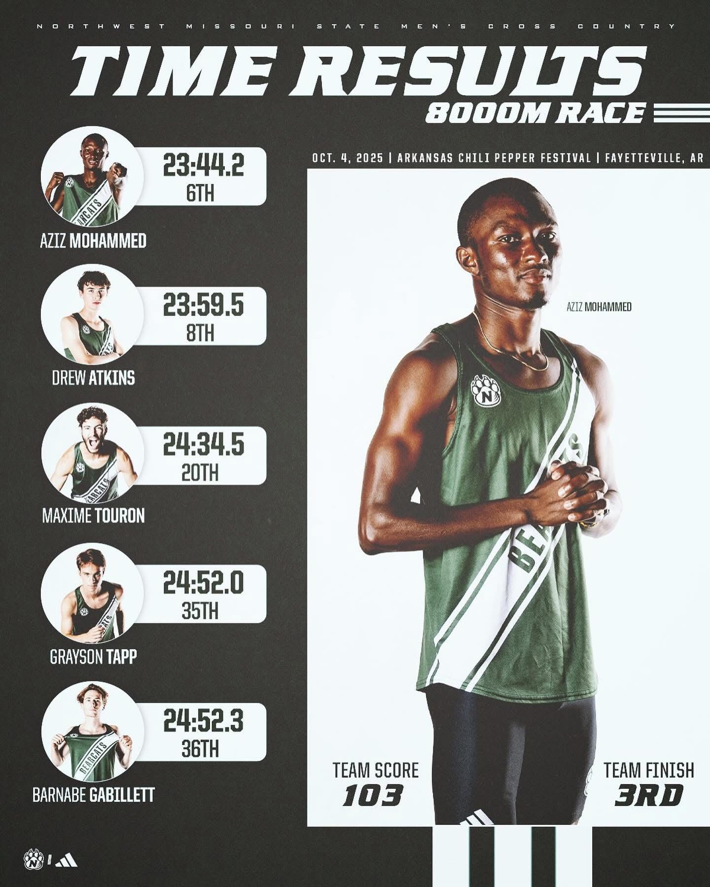 Ghana’s Aziz Mohammed set the ground running for Northwest Missouri State as he led the Bearcats men’s cross country team to a strong third-place finish at the Arkansas Chili Pepper Festival meet in Fayetteville.