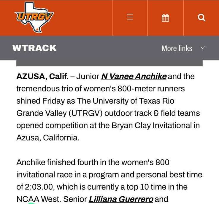 Friday’s effort also builds on a breakthrough indoor season in which she was named the SLC Women’s Indoor Newcomer of the Year in March 2026, while helping UTRGV claim its first-ever indoor conference title. That remarkable indoor campaign followed an equally impressive debut in cross country, where she also won the Southland Conference Newcomer of the Year title, earned second-team All-American standing, and led her team to a 30th-place finish at the NCAA South Central Regional.