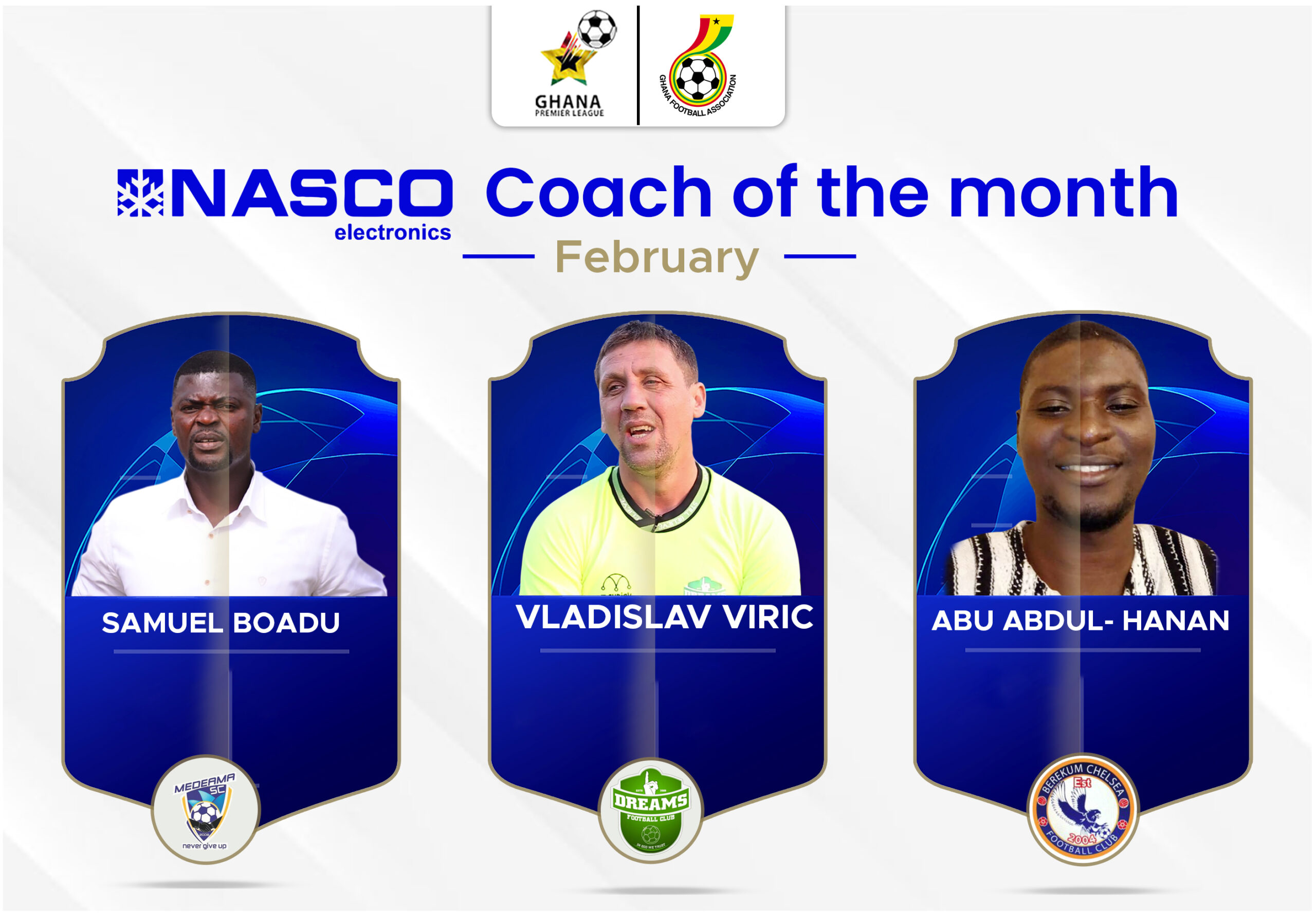 Samuel Boadu, Vladislav Viric and Abu Abdul-Hanan have been shortlisted for the Nasco Coach of the Month for February.