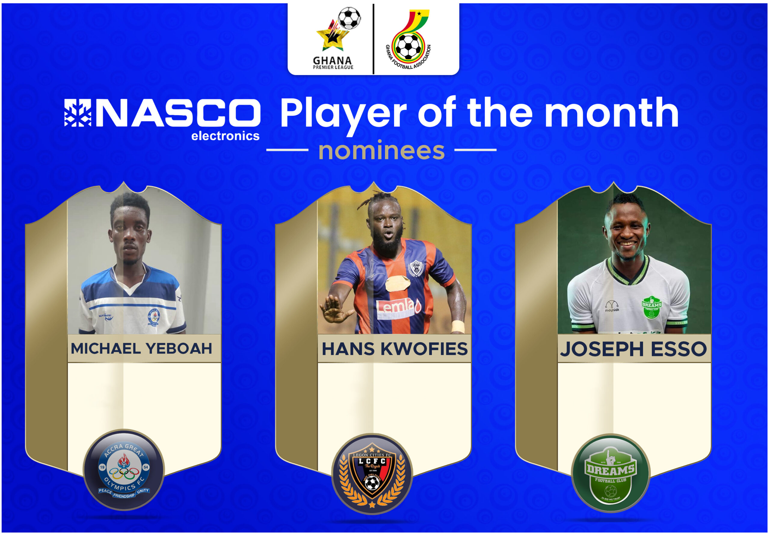 Great Olympics midfielder Michael Yeboah, Hans Kwofie of Legon Cities and Dreams FC’s Joseph Esso have all earned recognition for their respective performances in last month.