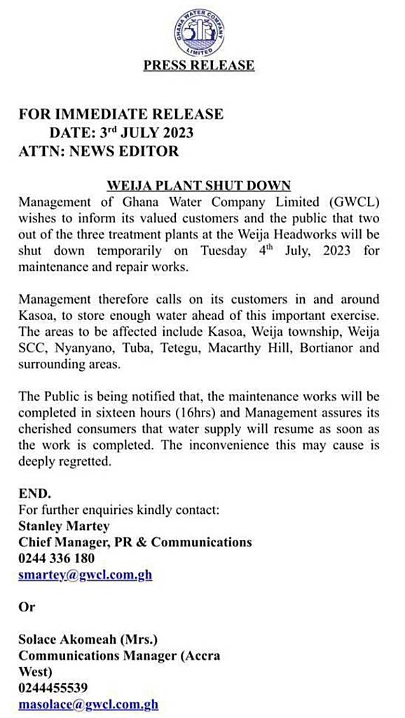 The management of Ghana Water Company Limited (GWCL), has issued a statement to announce the temporary closure of two out of the three treatment plants at the Weija Headworks.