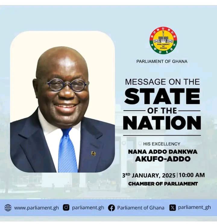 Outgoing President, Nana Addo Dankwa Akufo-Addo is expected to deliver his final State of the Nation Address (SONA) from the Parliament House on Friday, January 3, 2025, ahead of the dissolution of the 8th Parliament.