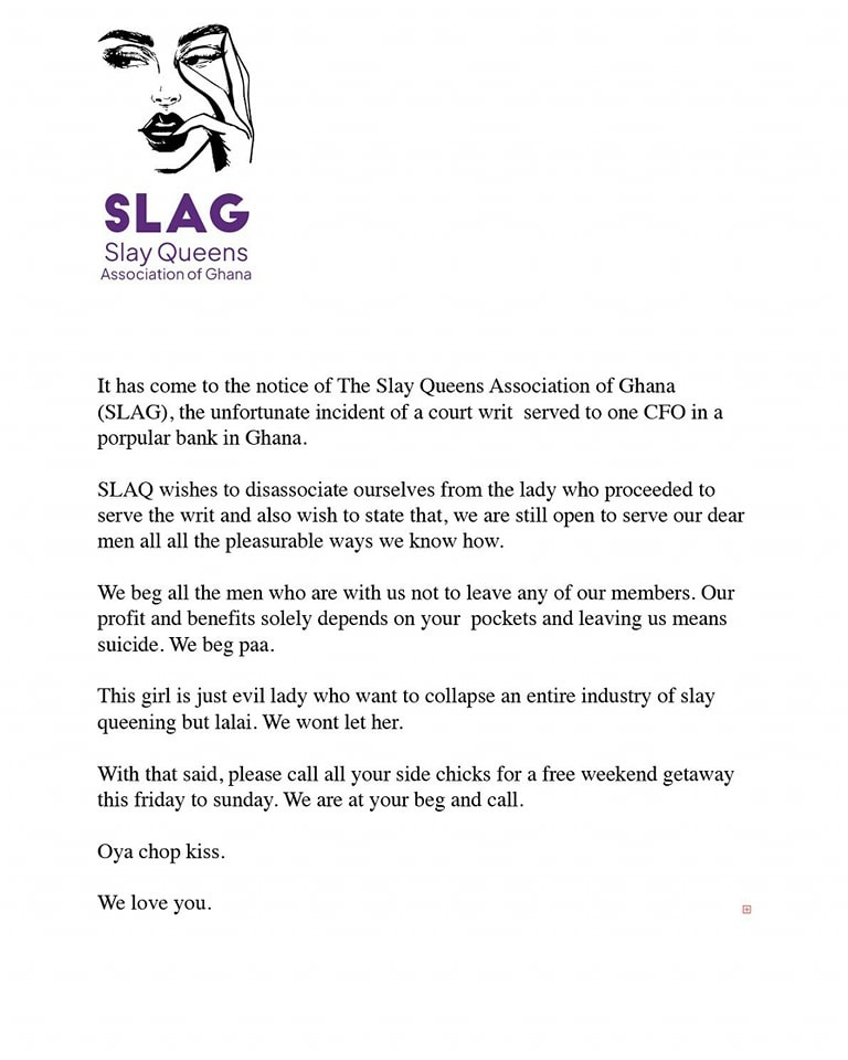 The Slay Queen Association of Ghana has issued a release to all Sugar Daddies to indicate that they are by no means in support of Deborah Seyram Dablah’s action against First Atlantic Bank’s CFO.