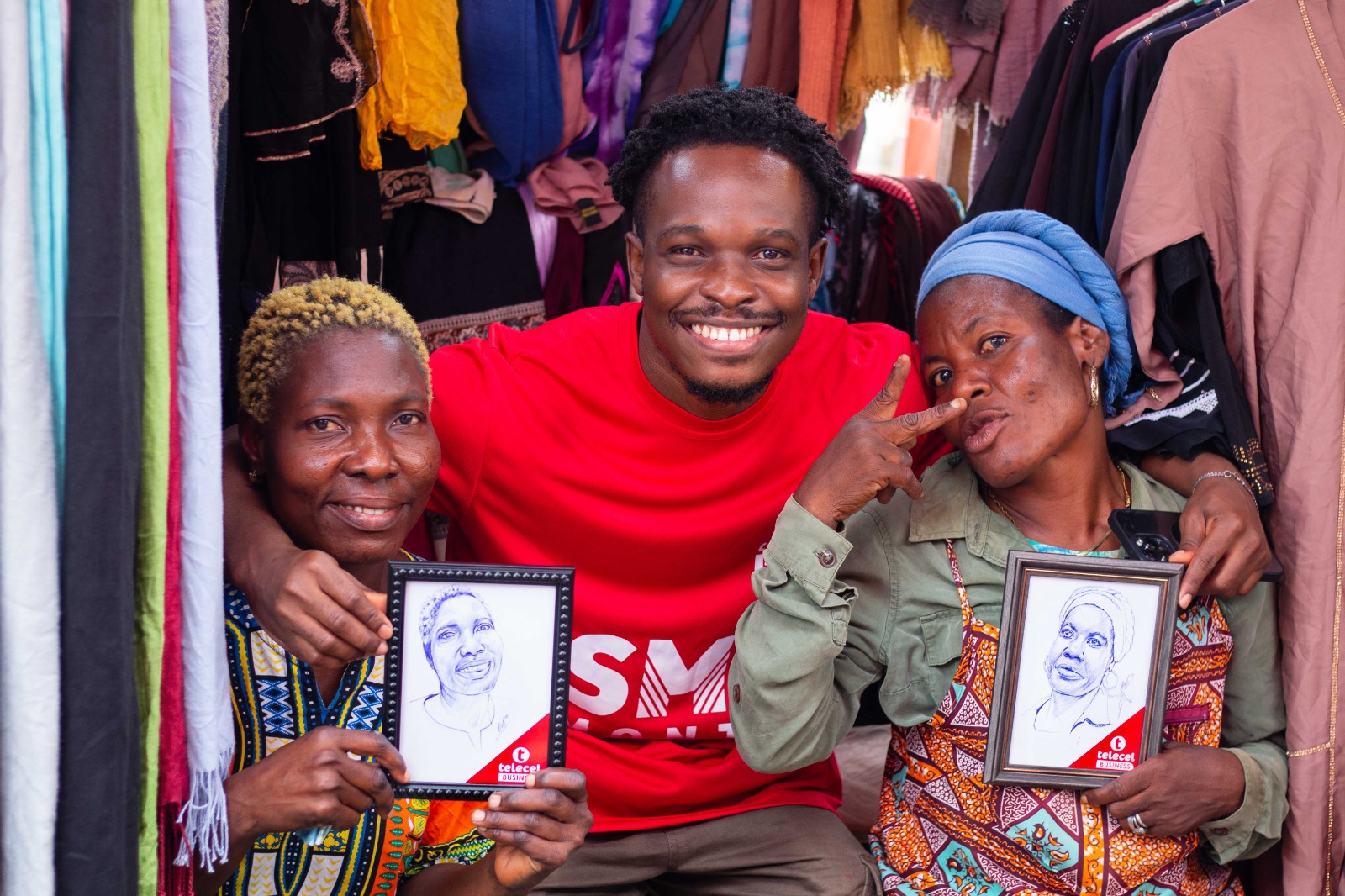 Within an hour, Enil secretly sketched a hyper-realistic portrait of a clothing trader sitting nearby behind her displayed wares. When Enil revealed the art to her, the trader’s jaw dropped as she couldn’t hide her excitement. Throughout the day, Enil drew the faces of other traders and craftspeople at Rawlings Park, who were full of smiles and surprise when the artist gave them their drawn portrait as gifts.