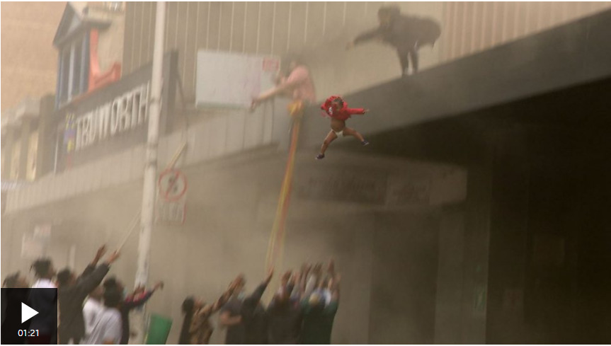 Media outlets captured the moment the woman dangled the child off the edge of the roof before throwing them down to a group of around half a dozen people.